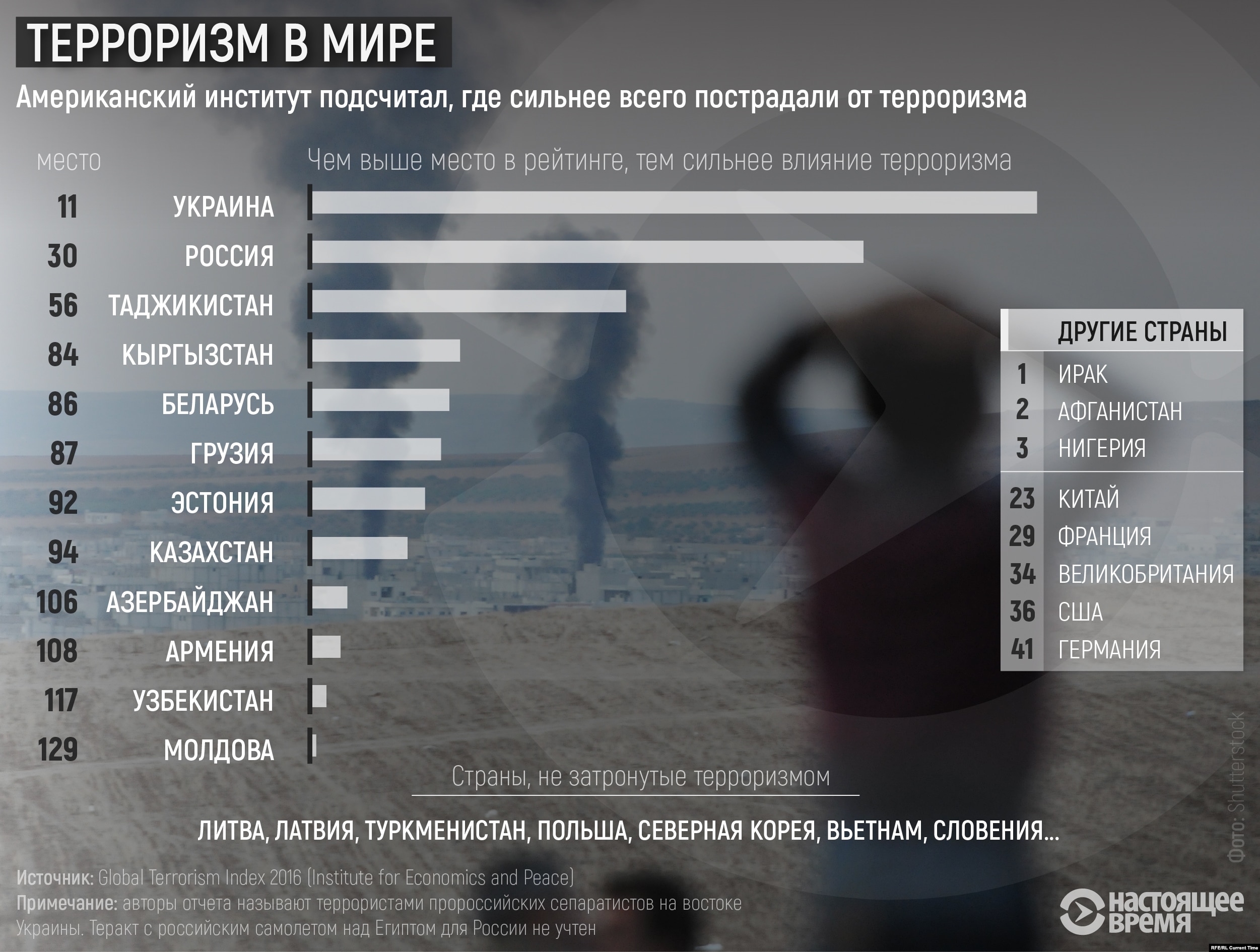 Украина в докладе занимает 11 место среди стран, наиболее пострадавших от терроризма из-за того, что исследователи причисляют пророссийских сепаратистов на востоке Украине к террористическим организациям.