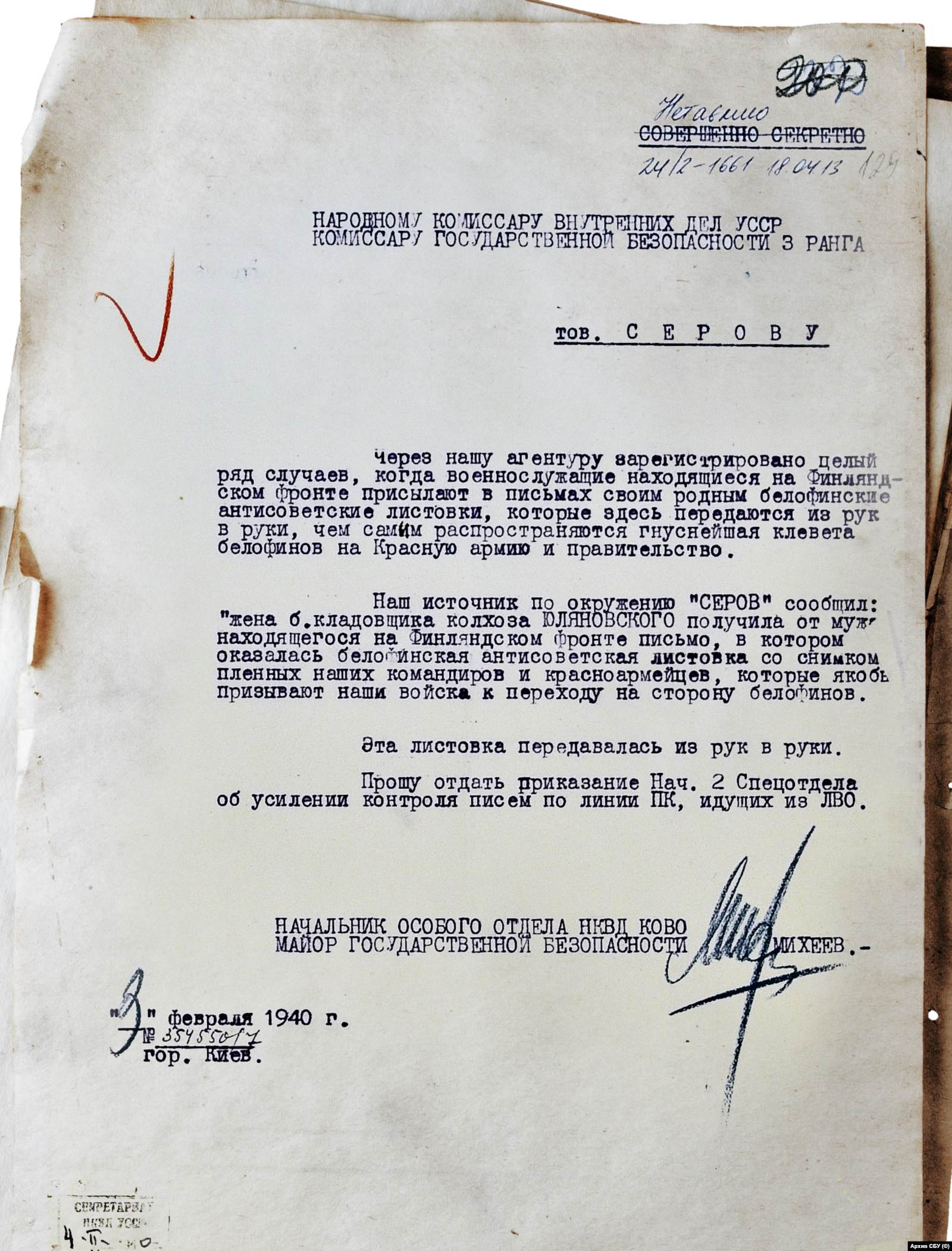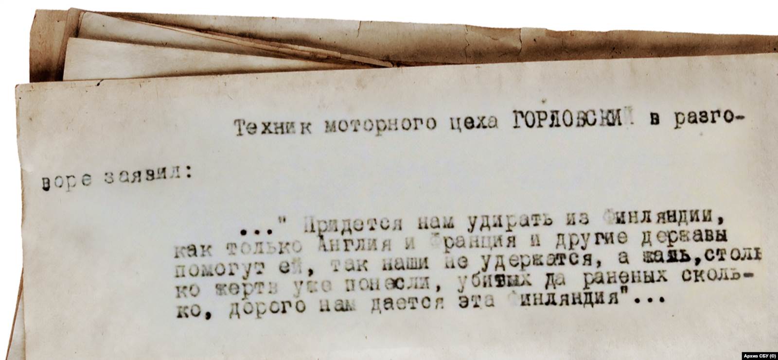 В другой записке речь шла о том, что находящиеся в Финляндии бойцы присылают "белофиннские" листовки в письмах к живущим в Украине семьям. Здесь эти листовки передаются из рук в руки, "чем самым распространяется гнуснейшая клевета белофинов (так в документе – НВ) на Красную армию и правительство".