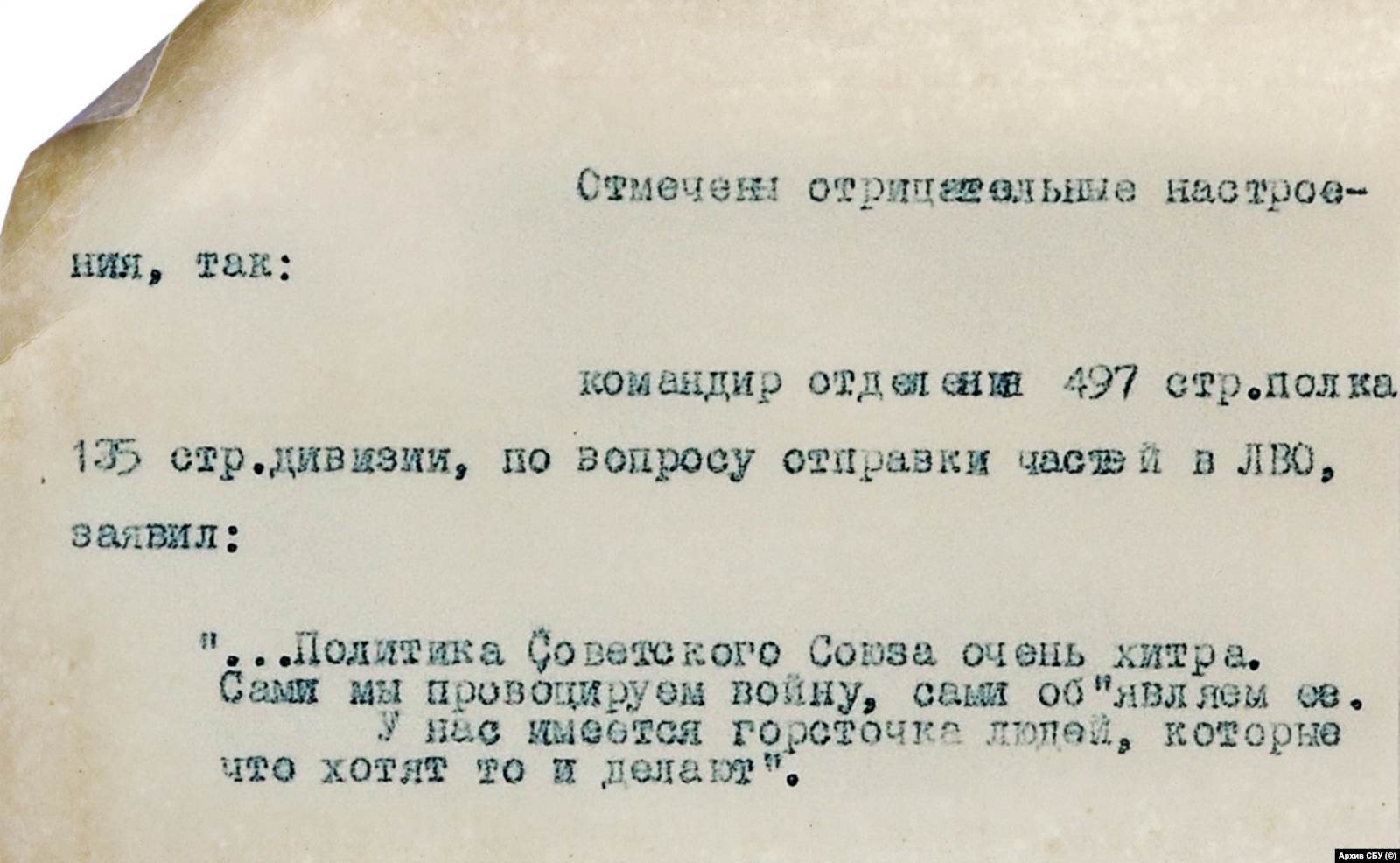 Настоящему Времени удалось отыскать документы двух округов из трех – Киевского особого и Харьковского. Как и в других военных округах по всему СССР, в них работали структуры, занимавшиеся наблюдением за настроениями военнослужащих, – так называемые особые отделы, которые собирали информацию и передавали в НКВД.