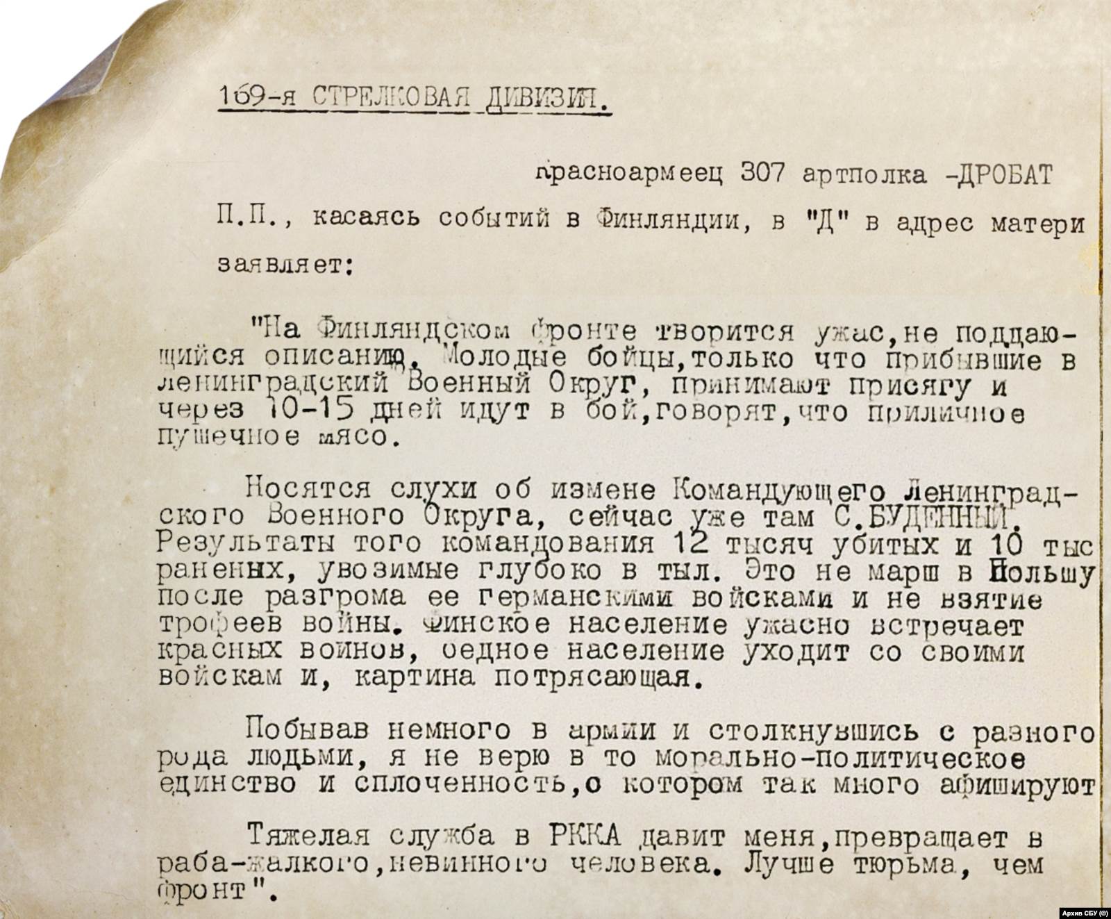 "Я знаю, что это не Финляндия напала на нас, а это при учениях на море наши обстреляли сами свою территорию", – заявил красноармеец 253-го гаубичного полка 7-й стрелковой дивизии Прокопчук, споря с сослуживцами.