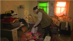 "Вещи там находятся, потом вещи здесь находятся. Люди приносят вот так. Мы перебираем, сортируем", – волонтер Ксения Каменских показывает свой небольшой склад. Дому требуется ремонт, но жить здесь никто не собирается. Поэтому владельцы разрешили волонтерской группе обустроиться здесь на время.