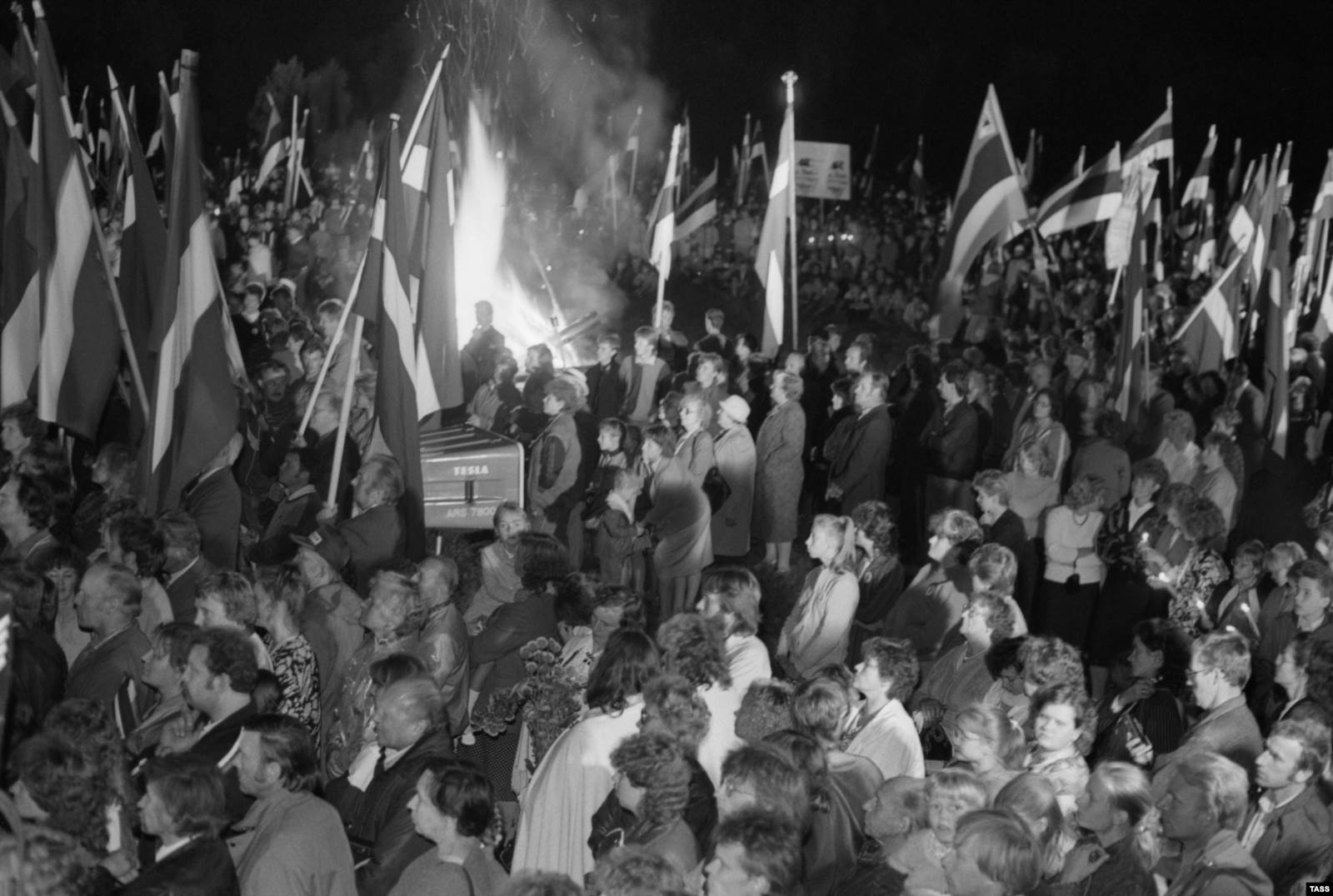 Национальные песни пели также во время акции "Балтийский путь", которая состоялась 23 августа 1989 года и была приурочена к 50-летию со дня подписания пакта Молотова – Риббентропа. Тогда более двух миллионов жителей Литвы, Латвии и Эстонии выстроились в живую цепь протяженностью около 670 километров, соединив три столицы – Вильнюс, Ригу и Таллинн.